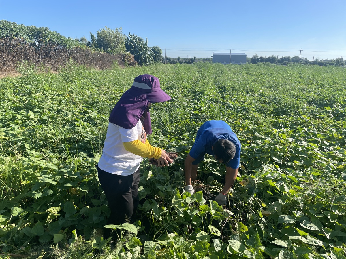 另外,彩紅與二林新住民關懷協會理事長陳立云熱情展示他們烘烤的香氣四溢地瓜外,還傳授我們烘烤地瓜的秘訣:「地瓜若要香甜綿密,要先放置一段時間『消水』,若用傳統大烤箱,建議以約攝氏230度烘烤約35分鐘,口感最為鬆軟香甜。」地瓜從種植到採收需時約4個半月至半年,1年1期的輪作節奏,使他們掌握土地的特性,也磨練出對時節的敏銳掌握。採收時,除了機械協助,也僱用工人,共同完成繁重的工作。這份對土地的敬重與專注,使地瓜的品質備受肯定。他們帶領我們走進田間,坤宗露出陽光般地大笑容,彎下腰在被翠綠地瓜葉覆蓋的田間,熟練地挖出一顆顆飽滿碩大的地瓜。夫妻倆在田裡的身影,勾勒出農村最質樸的美。大城的綠意田畦,不只是地瓜的故鄉,更是他們的根所在。