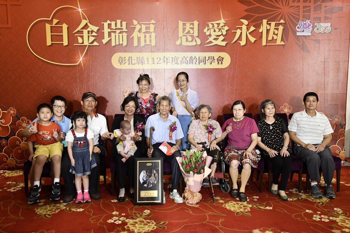 家有一老如獲至寶,家有二老幸福美好!彰化縣政府7日上午在花壇全國麗園餐廳,舉辦「112年度高齡同學會活動」,活動由源泉不老樂團及知名藝人劉福助表演演唱揭開序幕,縣長王惠美到場與長輩同歡,今年彰化縣百歲人瑞最高齡的是溪湖鎮107歲的錢金治女士,105歲的有1位,104歲的有2位,103歲有4位,102歲有7位,101歲有9位,100歲有13位。