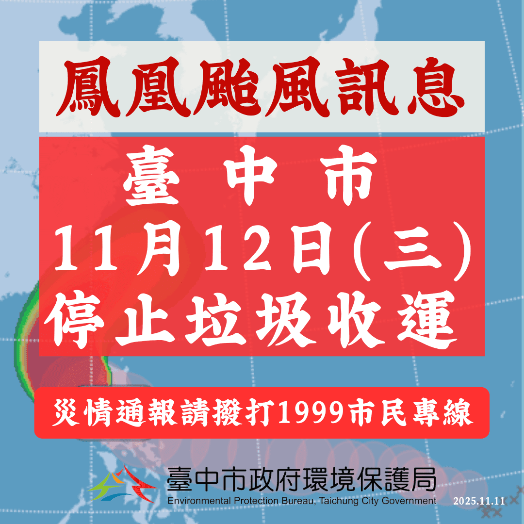 因應鳳凰颱風來襲,台中市政府已宣布明日停止上班、停止上課。環保局考量民眾及清潔隊員人身安全,明日暫停垃圾收運服務,請民眾留意配合。