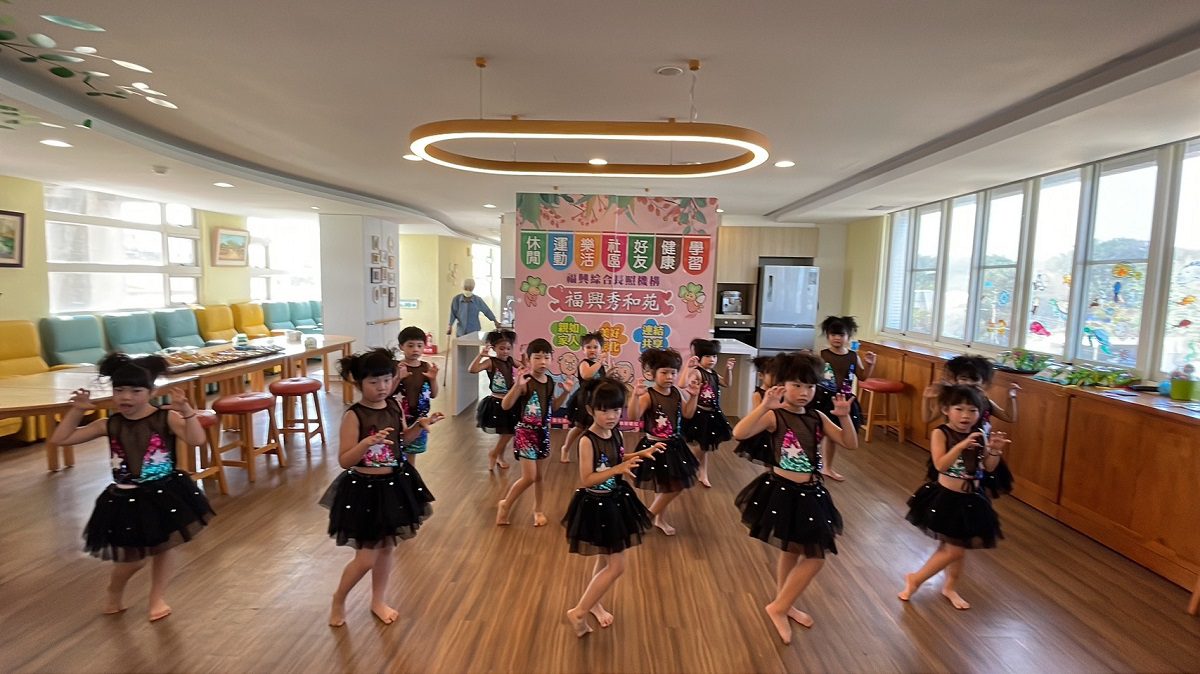 為了表演舞蹈給阿公阿嬤看,老師特別幫小朋友精心打扮,一身亮片網格衣裙,活潑又俏麗。園長施懿玲說,很高興能夠帶孩子來表演,未來幼兒園也要試行「老幼共園」,讓老幼兩個世代能夠互相學習、成長,期待下次還能再安排孩子來日照中心與長輩們互動。