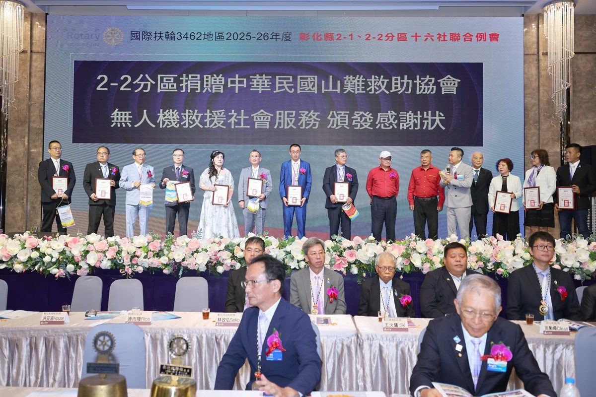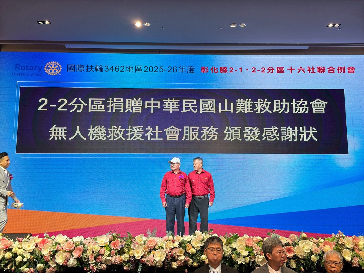 國際扶輪3462地區彰化縣 2-2 分區所屬八個扶輪社今日聯手共同捐贈救援無人機與穿越機予中華民國山難救助協會,期望提升山域搜救效率,為台灣登山者打造更堅實的安全防護網。在前總監林伯龍Doctor推薦和協助下,此次參與捐贈的扶輪社包括彰化中區、鹿港、彰化松柏、彰化東區、鹿港東區、彰化東北、花壇及彰化福興東區等八社,展現分區高度的凝聚力與在地公益能量。