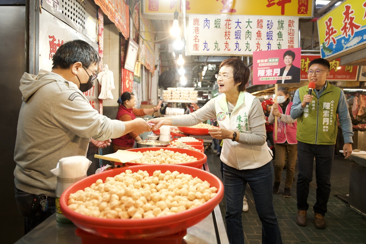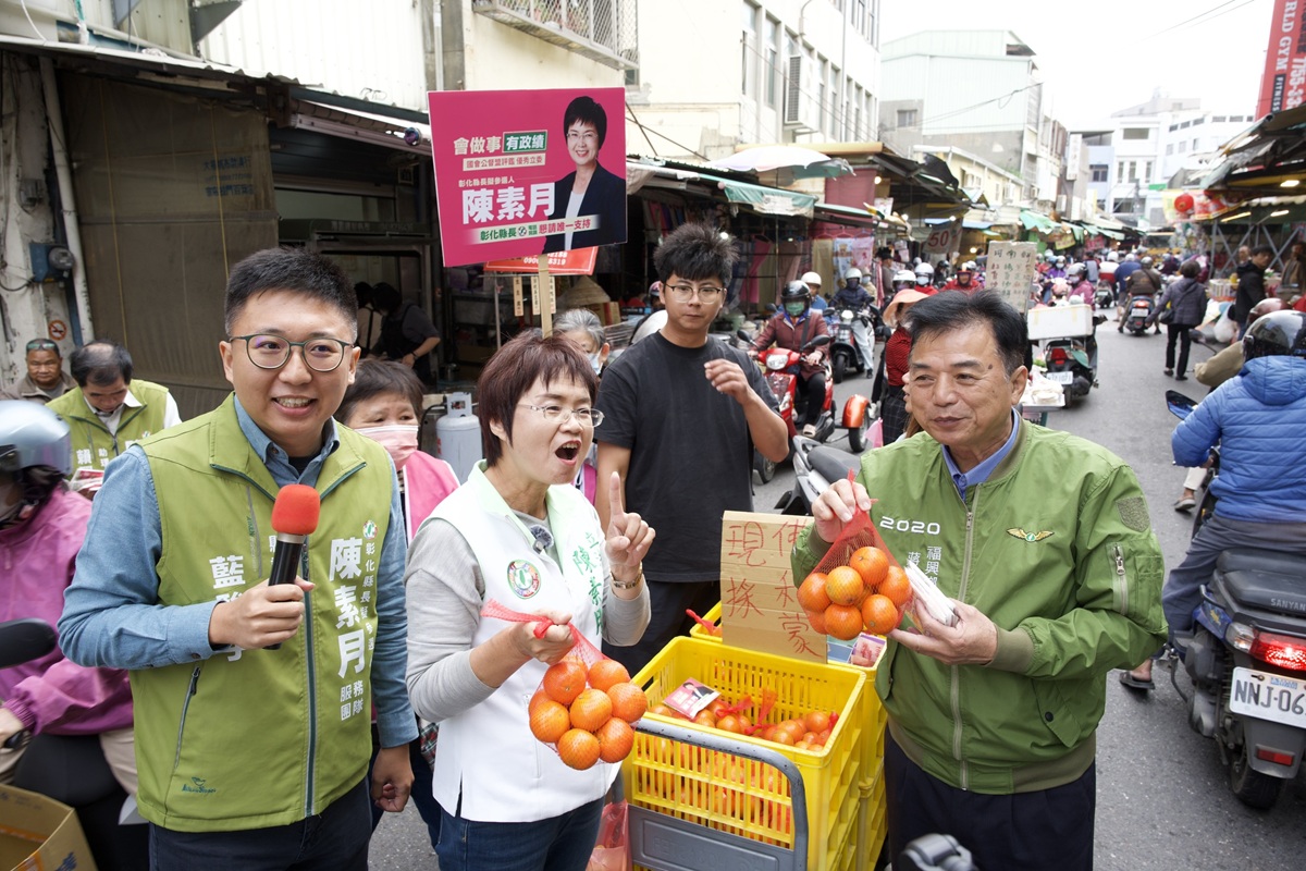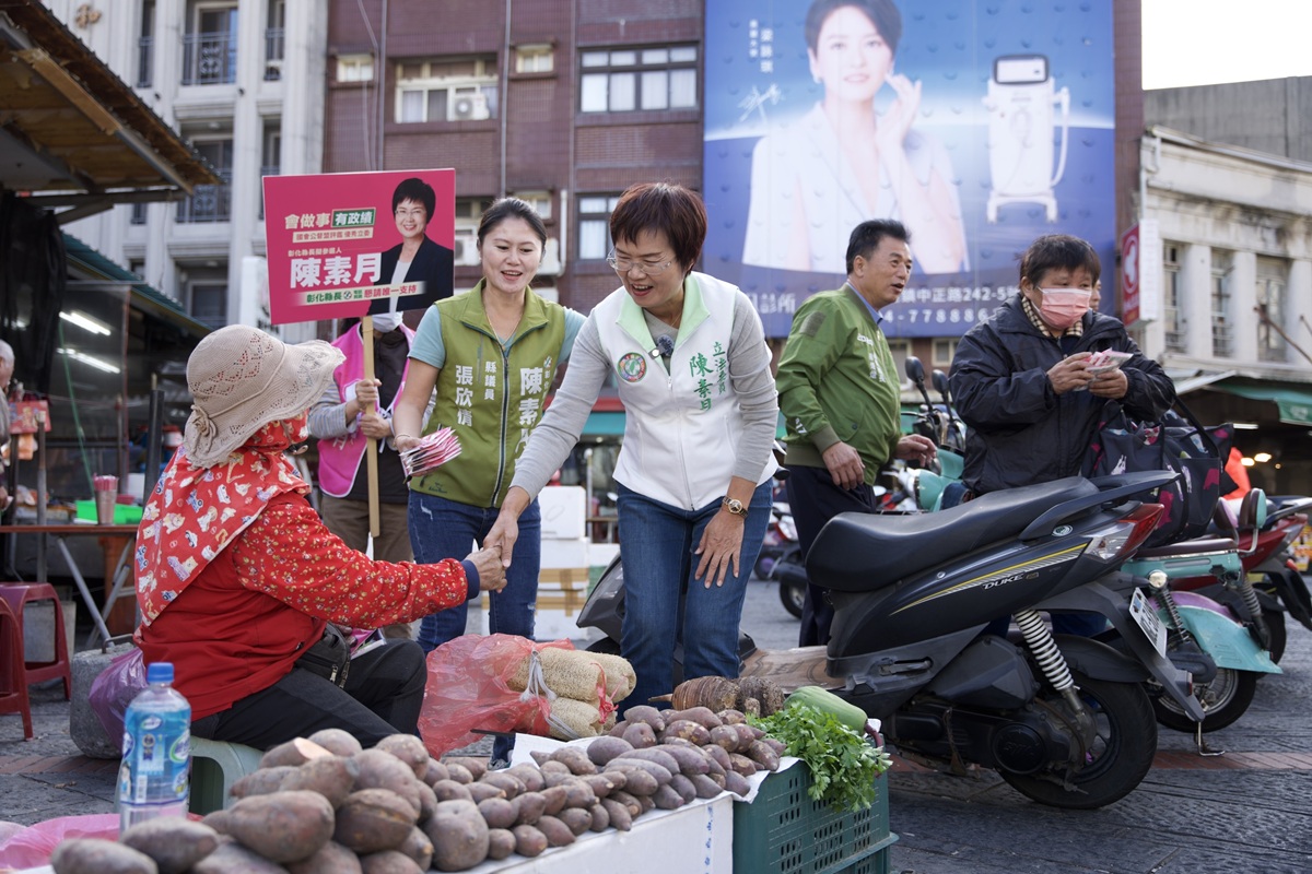 民進黨彰化縣長擬參選人陳素月今(27)日上午前往鹿港第一市場掃街拜票,福興鄉長蔣煙燈、議員藍駿宇、劉珊伶、張欣倩等人陪同,一行人向攤商與民眾爭取12月15日至18日接到電話民調「唯一支持陳素月」。掃街過程中,陳素月多次聽到民眾熱情加油,讓她直呼相當感動。