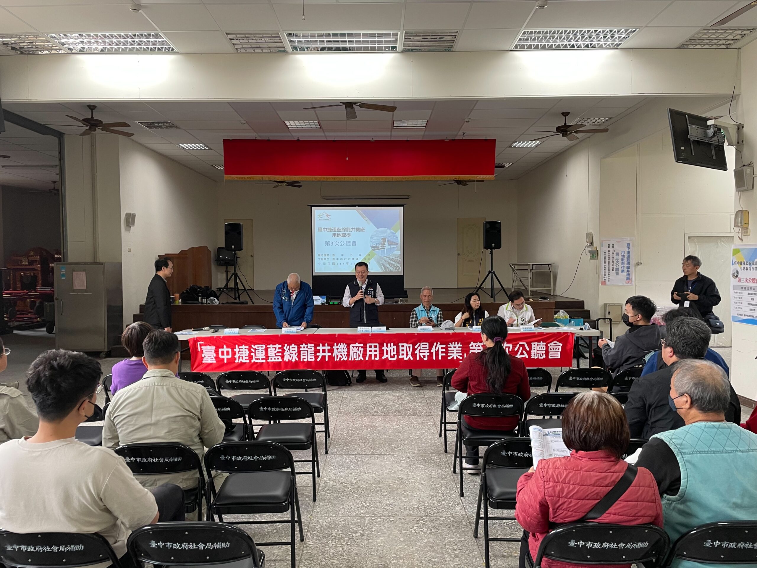 台中市政府捷運工程局今(27)日在龍井區新庄里活動中心舉辦「台中捷運藍線龍井機廠用地取得」第三場公聽會,向土地所有權人說明計畫內容並蒐集意見,確保用地取得程序公開透明,兼顧地方發展與民眾權益。