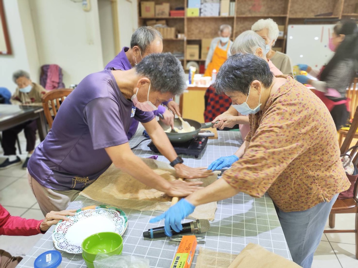 長輩們在老師協助下分工合作,有的攪拌、有的切割、有的桿壓、有的裝填,互相提醒、彼此稱讚,場面熱鬧溫馨,大家忙得不亦樂乎。當作品完成端上桌時,長輩們臉上滿是開心笑容,紛紛表示:「自己做的最好吃!」整個活動洋溢著濃濃幸福感。
