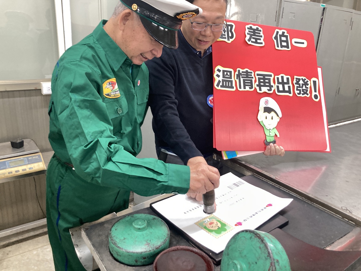 ▲郵局同仁還帶他重溫以前的工作,包括坐郵務車、整理信件、蓋郵戳等。(圖/秀傳提供)