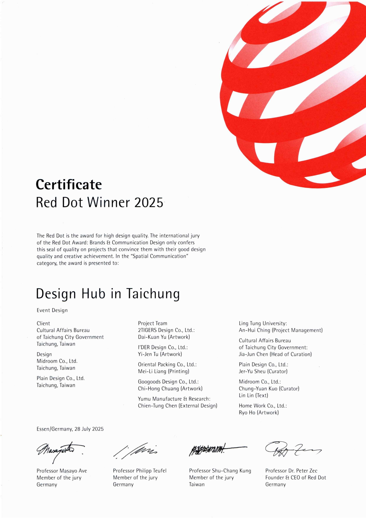台中市政府文化局以「2024創意台中」「Design Hub in Taichung」,獲得設計界奧斯卡美譽的2025德國紅點設計大獎—品牌與傳播設計類(Brands & Communication Design)殊榮,在全球近萬件參賽作品中脫穎而出,同年度亦獲得「2025金點設計」標章,充分展現台中在品牌形象與設計傳達上的卓越實力。