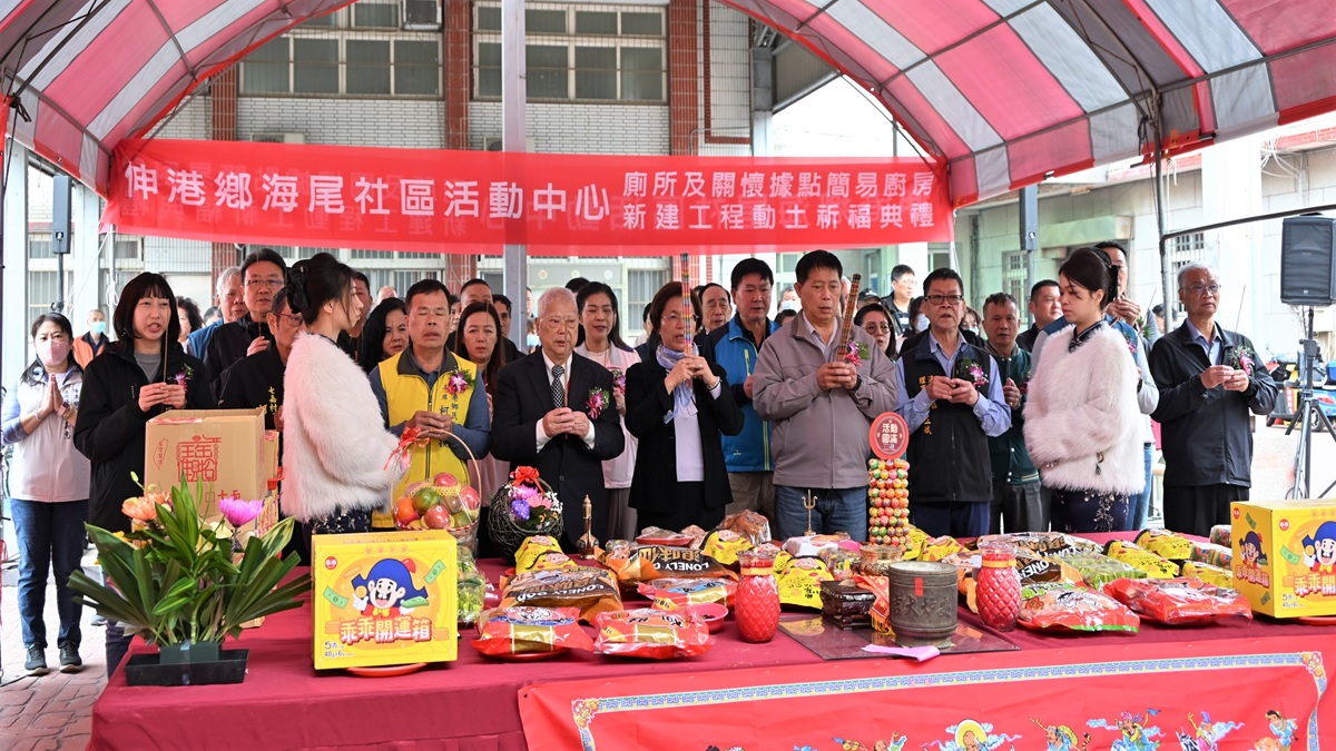 打造老有所依的舒適環境!伸港鄉公所於今日上午舉行「伸港鄉海尾社區活動中心廁所及關懷據點簡易廚房新建工程」動土典禮,彰化縣長王惠美、伸港鄉長黃永欽、伸港鄉民代表會主席柯嘉換、海尾社區發展協會理事長周正斌等人與會祈福。本案工程經費由縣府補助450萬元、伸港鄉公所自籌620萬元,工程總經費1,070萬元。將興建地上2層、總樓地板面積約40坪的建物,完工後將能提供鄉親更舒適且便利的關懷據點場地及活動場所。