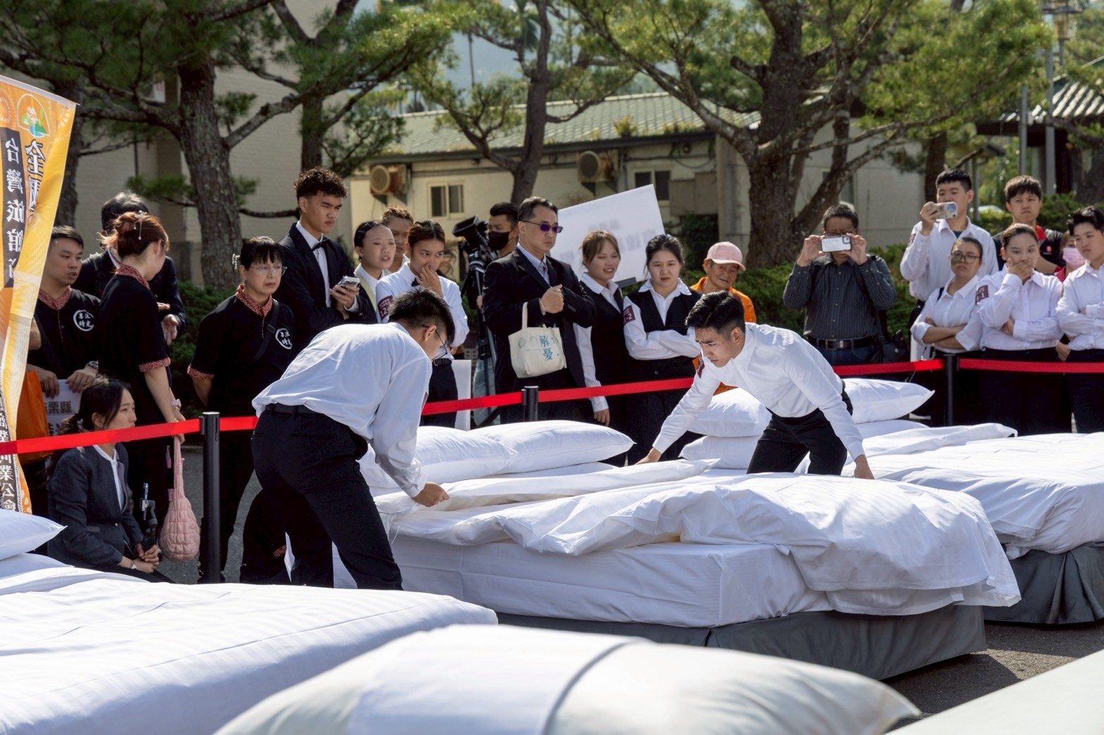 本屆賽事吸引全台餐旅科系學生與旅館從業人員熱烈參與,全國共有80多組、超過 200位選手報名角逐。來自各縣市的強隊紛紛翻山越嶺前來參賽,其中包含最遠自台東出發的隊伍,更凸顯這項全國性賽事的吸引力與指標性。比賽分為高中職組、大專組與在職組三大組別,並設置「整床」與「托盤」兩大項目,以多元面向完整檢視選手的服務技能。整床競賽著重協作默契、鋪設流程熟練度與成品整潔美觀;托盤競賽則考驗選手的穩定度、儀態與行走技巧,展現餐旅服務的專業素養。餐旅服務競賽不僅是展現專業能力的舞台,更是培育新世代餐旅人才、推動產業升級的助力。