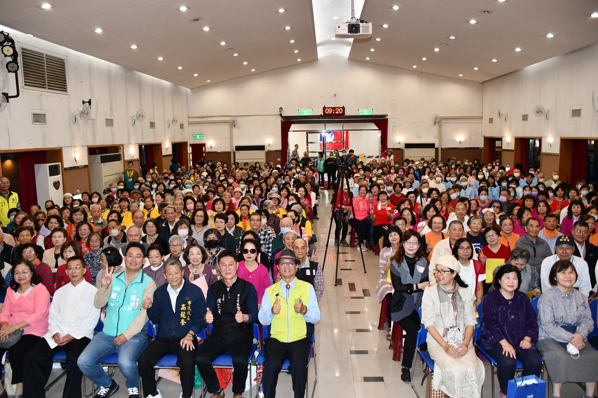 ▲林世賢市長(前排中左1)與市民代表會主席陳文賓(前排中左2)等人和500位長青大學學員。(圖/記者蕭麗鳳攝)