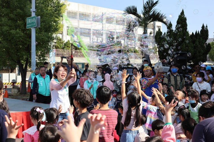 上午的活動,安排魔術秀、泡泡秀還有氣墊遊樂設施,大小朋友宛如置身遊樂園。黃秀芳則由立委陳秀寳等人陪同,一起和親子在馬路塗鴉,有孩子畫出卡通人物,也有人寫下「我愛臺灣」,還有親子創作「八卦山大佛」,馬路宛如一塊大型畫布。