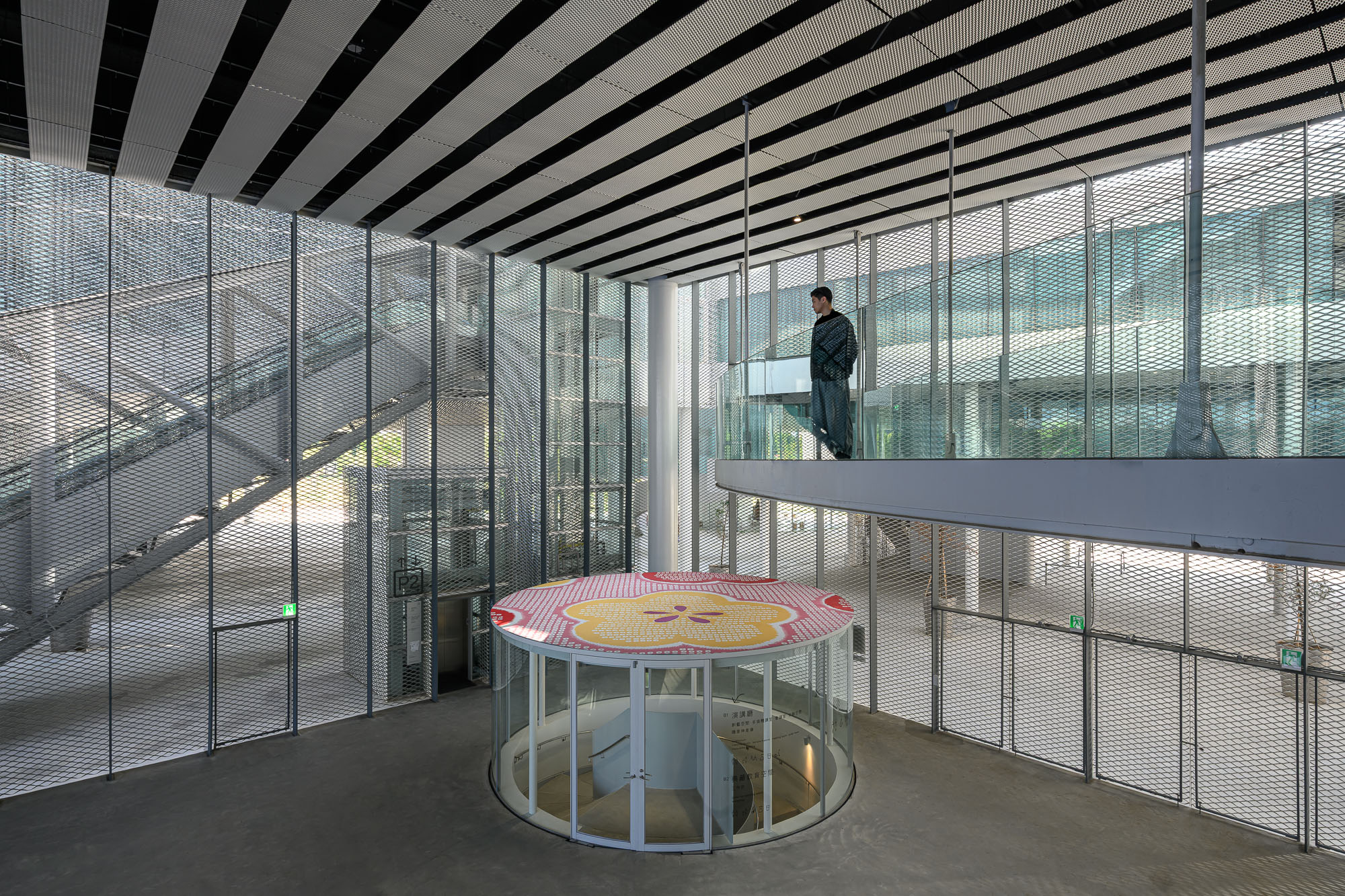 林明弘的《再製》(Processed)則以另一種姿態與建築結構巧妙交織。兩組手繪梅花圖樣佔據入口大廳的兩間玻璃屋屋頂:一組線條精確,另一組錯位重疊,透過如印刷過程中的重疊與錯置手法,將具有時代意義的「台灣花布」圖騰賦予新意。當觀眾在連通美術館與圖書館的天橋上移動時,可以發現圖樣隨視角轉換而變化,構成一場關於感知、觀看與空間的詩意對話。林明弘認為觀眾的觀看也是作品的一部分,使藝術不再僅是被注視的對象,而是與建築、身體、光影共同生成的經驗。