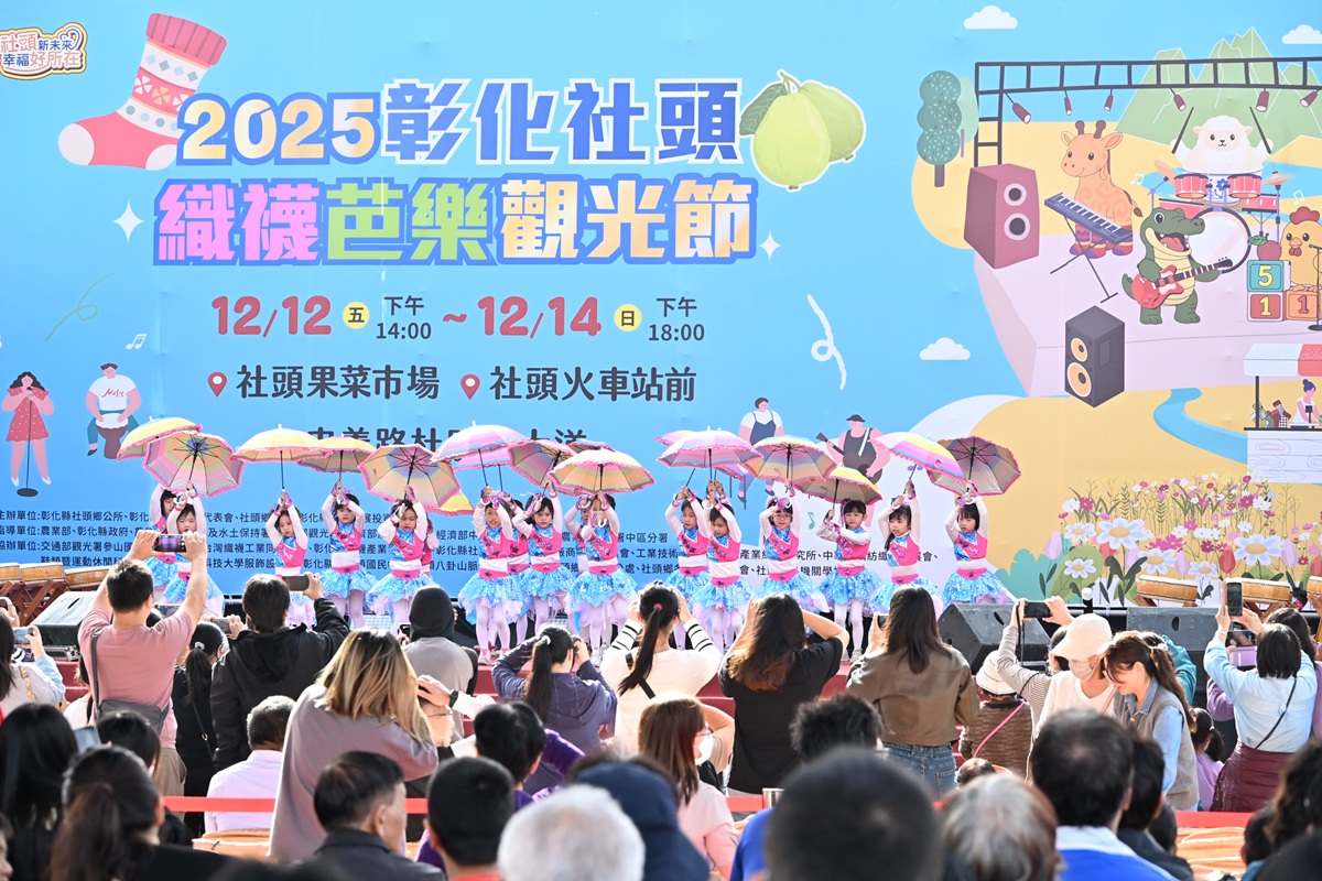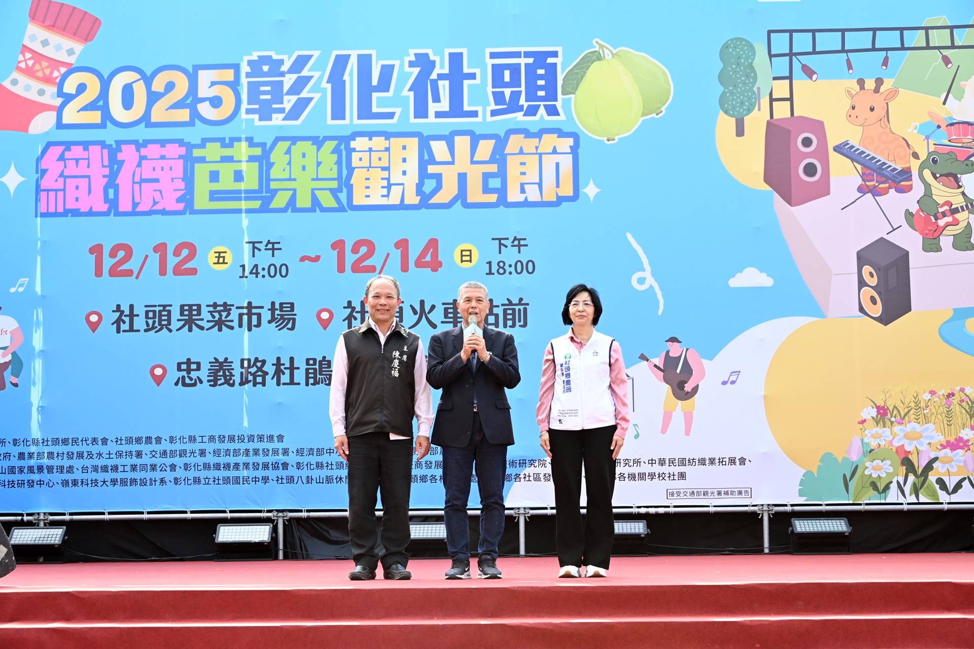 「2025彰化社頭織襪芭樂觀光節暨社頭農遊季」今日上午於社頭果菜市場盛大開幕,12月12至14日在活動現場有全國最大的織襪精品、農特產品展售、地方小吃、演唱會及煙火秀等精彩活動,還有芭樂創意料理免費品嚐、摸彩、打卡送好禮、發票換襪子、織足藏樂館促銷等好康活動,邀請全國鄉親安排假期暢遊社頭,購買社頭優質芭樂及好襪。