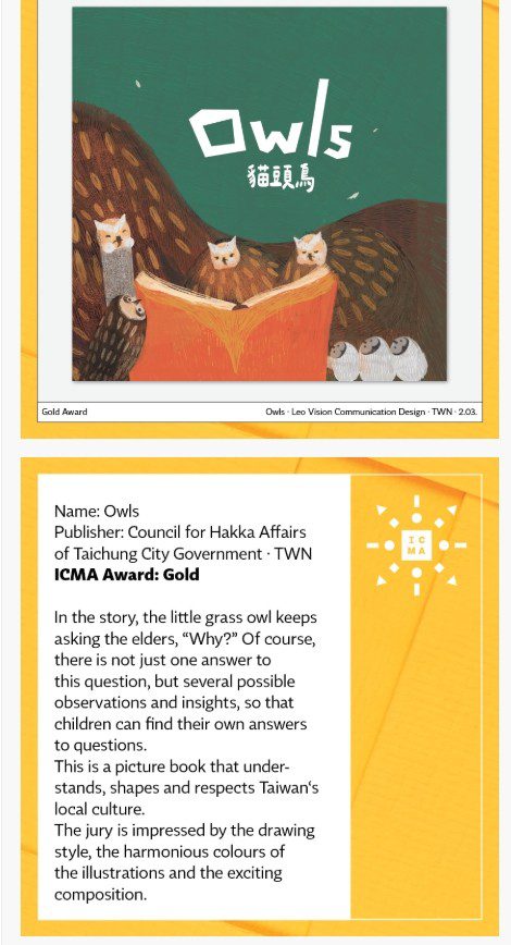 台中市政府客家事務委員會推動客語文化創作成果再傳捷報!客語繪本《貓頭鳥》以溫潤細膩的圖像風格與生動自然的客語文字,描繪台中山城客家重要祭典文化,成功打動國際評審目光,一舉榮獲德國「ICMA國際創意媒體大獎」書籍類兒童與青少年書籍金獎,以及美國「Moonbeam兒童圖書獎」2025年度評審金獎,成為少數同時獲得歐美國際大獎肯定的客語繪本,展現台中推動客語教育與文化創作的豐碩成果,也讓台中客家故事正式走向世界。