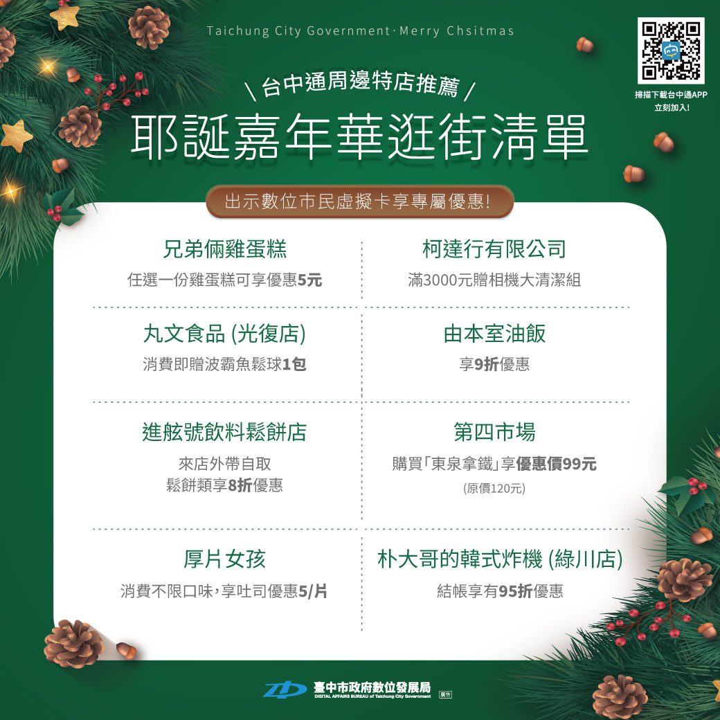 林局長說,在耶誕嘉年華期間於《台中通》特約店家消費並出示數位市民虛擬卡,就能把優惠帶回家!包括柯達行有限公司消費滿3,000元,贈送相機大清潔組;丸文食品(光復店)來店消費即贈波霸魚鬆球1包;朴大哥的韓式炸雞(綠川店)結帳享95折優惠;《由本室油飯》推出全品項9折優惠。