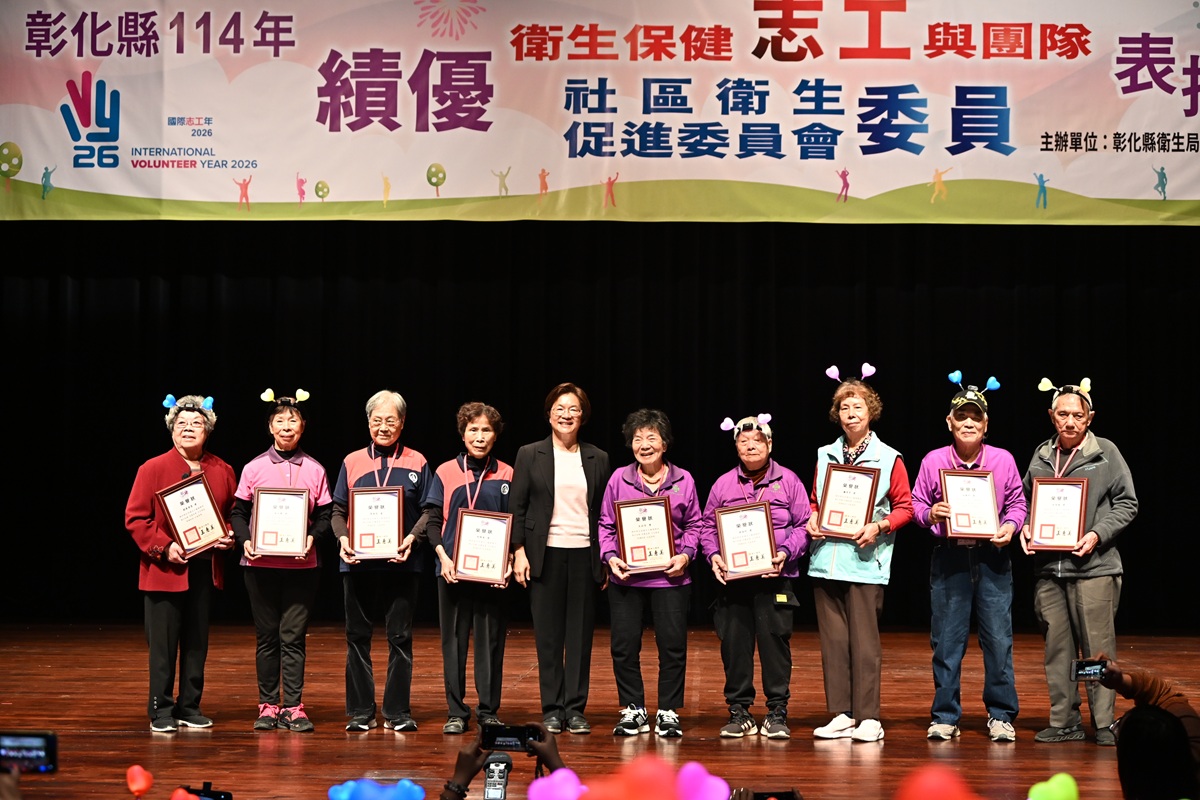 彰化縣衛生局於今日上午於員林演藝廳舉辦「114年衛生保健績優志工與團隊暨社區衛生促進委員會績優委員表揚大會」,縣長王惠美親臨現場頒獎。此次活動除了表彰績優個人與團隊的卓越表現,也誠摯感謝超過1,700名衛生保健志工與將近800名衛生促進委員長年對公衛業務的無私奉獻,攜手推動縣內多項衛生保健工作,展現社會溫度與大愛精神。