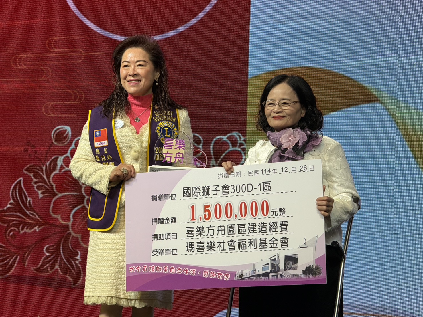 國際獅子會300D-1區長期關懷弱勢族群,為協助身心障礙者打造穩定就業與友善生活支持環境,(26)日於聖誕感恩週舉辦「喜樂方舟園區募款餐會」,席開30桌,獅友們熱情響應,盼能縮短尚有新台幣1.2億元的建設缺口,加速推動園區落成。