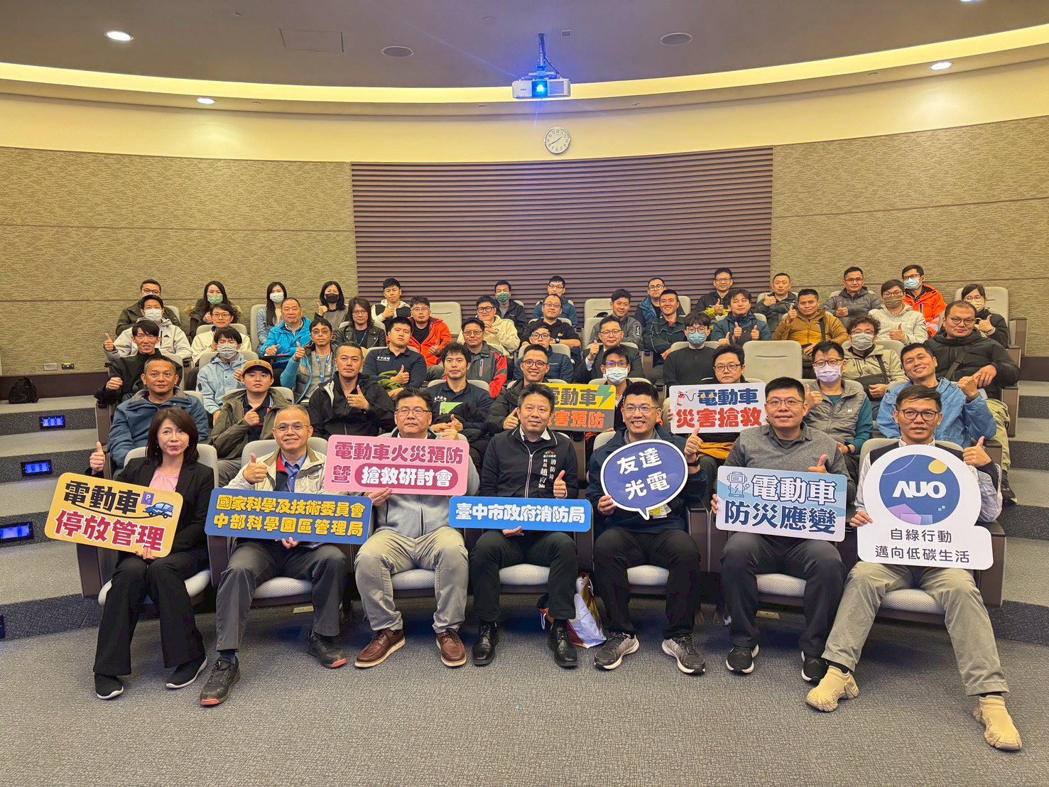 消防局說明,該研討會在友達光電股份有限公司一期廠區舉辦,由各縣市消防局、中科園區各事業單位防火管理人、消防或緊急應變人員、職業安全衛生管理人員共同與會,研討會除了各項議題交流及探討,同時實際講解消防局各項電動車輔助滅火器材。