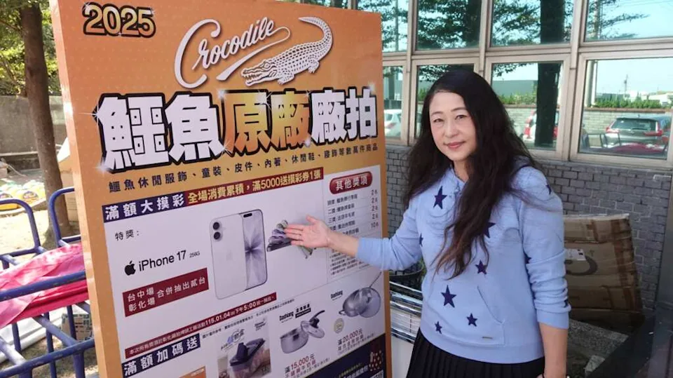 鍾文玲說,鱷魚原廠廠拍彰化埤頭工廠活動將於12月31日開幕,當日上午9點20分推出「一元商品大搶購」活動,現場準備外套、褲子及上衣等商品,每件只要1元,每人限搶兩件,希望讓到場民眾都能搶到超值好康。此外,活動期間單筆消費滿5,000元即可獲得300元折價券及摸彩券,最大獎為iPhone 17,將於1月4日下午5點在活動現場以直播方式公開抽出,並同步抽出其他多項獎品。