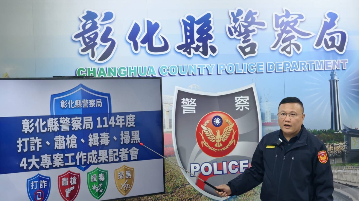 警察局今年迄今各項查緝成果亮眼,累計查獲詐欺集團340件、犯嫌2,161人次,並查扣汽車、現金、土地、房屋及虛擬貨幣等總計價值7億3,005萬餘元;攔阻詐騙金額達4億8,616萬餘元,累計阻斷詐團金流突破12.1億元;執行掃黑成果,共檢肅治平案件首惡46人,犯嫌人數共297人,查扣沒收不法金流總價值達3,704萬9,500元;查獲毒品案件人數1,820人,其中製造、運輸、販賣供毒網絡254人,查扣毒品咖啡包7,224包、喪屍菸彈1,866顆。查獲非法持有槍械案件24件24人,查扣制式槍枝1枝、非制式槍枝22枝及模擬槍6枝,破獲改造槍械處所3處,績效卓著,有效淨化彰化縣治安環境。