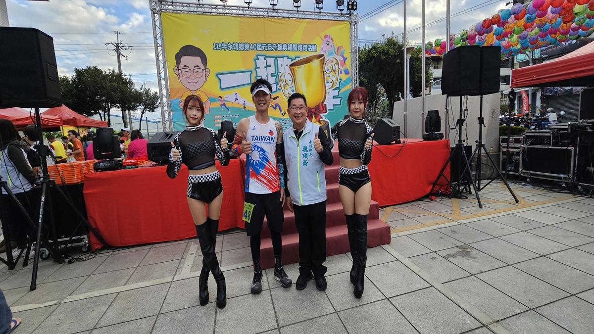 永靖鄉元旦路跑自創辦以來,已邁入第40屆,是鄉內歷史悠久且最具代表性的年度運動盛會。鄉長魏碩衛帶領全體與會貴賓及跑者參加元旦升旗典禮,齊唱國歌,象徵團結與希望,共同迎向2026年嶄新的一年。感謝頂新和德文教基金會自107年起開始贊助起跑拱門,至今已連續第九年,持續支持永靖在地活動,今年特別邀請味全龍啦啦隊「Dragon Beauties小龍女」成員心璇、小蛙、群群帶來精彩的開場舞表演,此外,永靖鄉公所也邀請「員永村社區大學」帶來活力暖身操,氣氛熱烈歡騰。