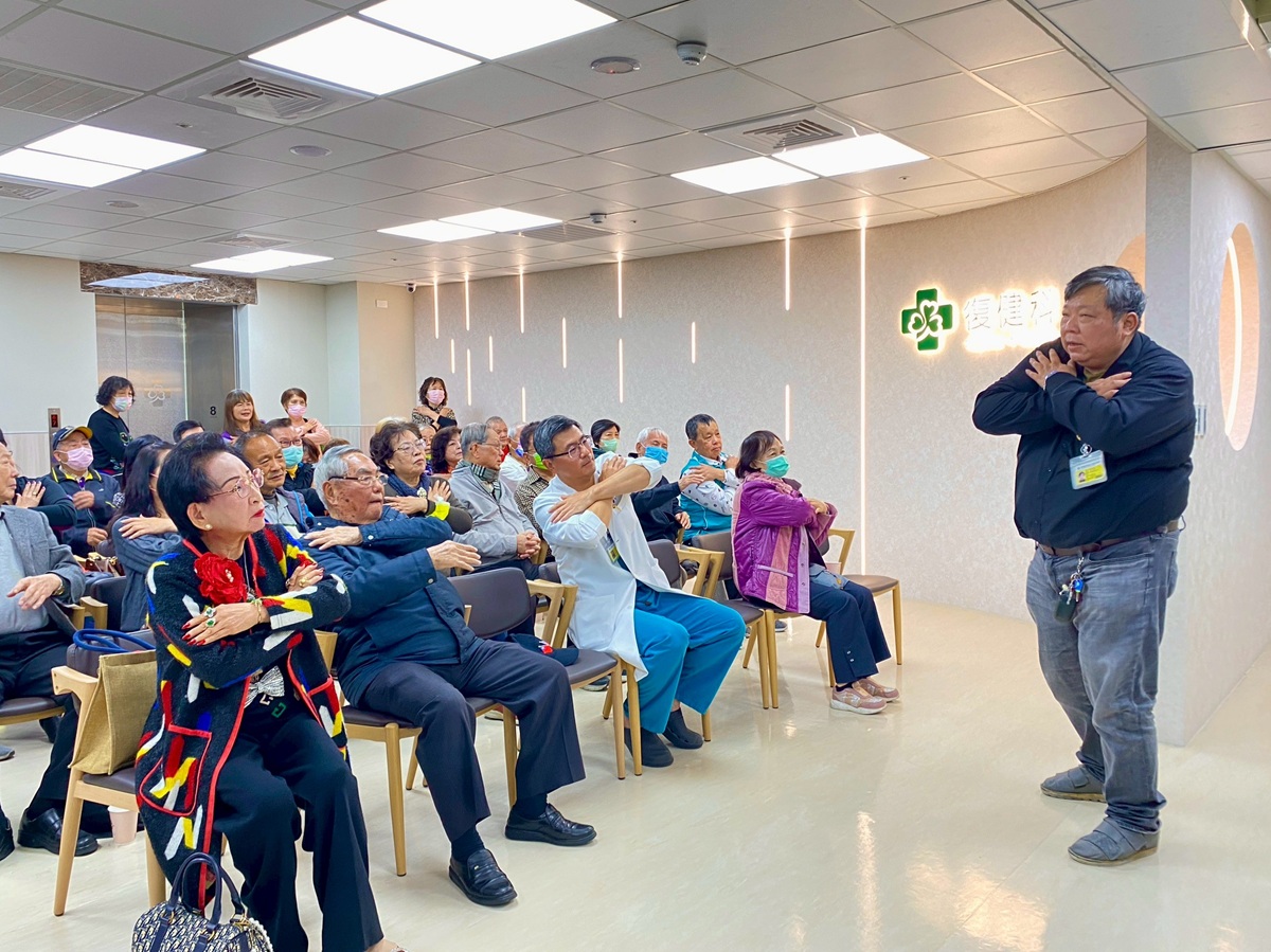 為了讓復健更加貼近生活,現場安排「居家防傷復健操」示範教學,將年終大掃除的常見動作轉化為安全的鍛鍊技巧。治療師指出,許多人在大掃除後出現腰痠背痛,其實多半與長時間彎腰、抬頭或搬重物姿勢不當有關。因此,學會正確打掃與保護身體同樣重要。