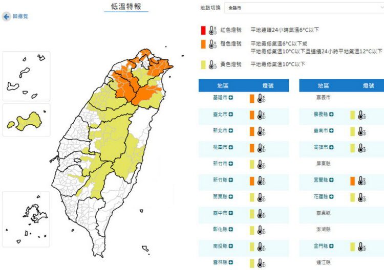 氣象署上午發出低溫特報,非常寒冷的區域有:新北、基隆、臺北、桃園、新竹縣、宜蘭等縣市有持續10度左右或以下氣溫發生的機率;寒冷區域則有:新竹市、苗栗、臺中、彰化、南投、雲林、嘉義縣、臺南、高雄、花蓮、金門等縣市,有10度以下氣溫發生的機率。請注意保暖,農作物及水產養殖業注意寒害。