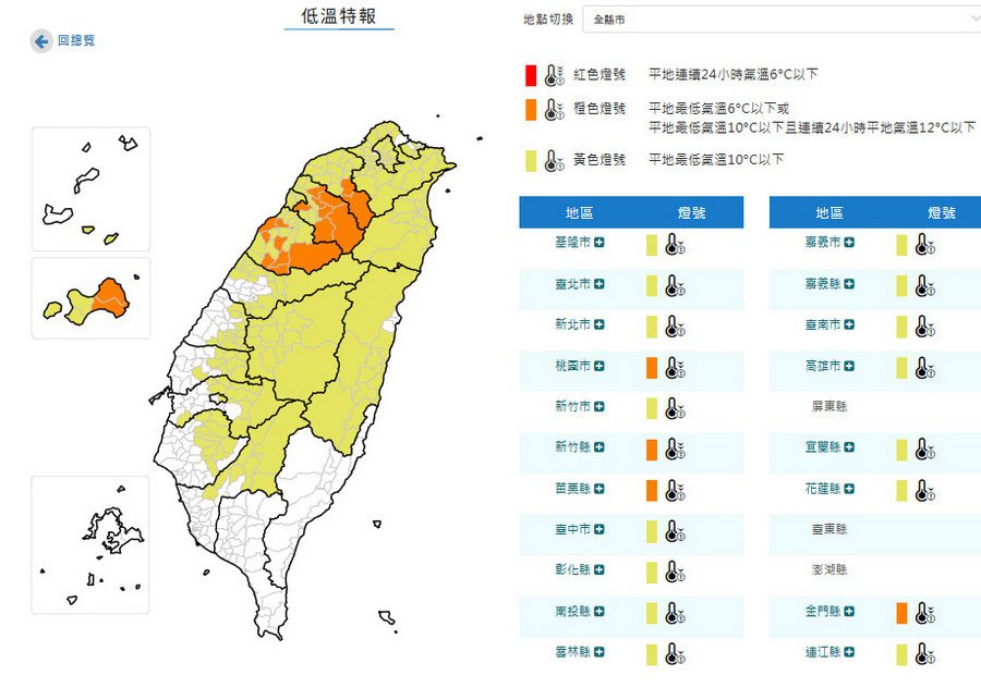非常寒冷的地區有:桃園、新竹縣、苗栗、金門等縣市有6度以下發生的機率;寒冷地區有:新北、基隆、臺北、新竹、臺中、彰化、南投、雲林、嘉義市、嘉義縣、臺南、高雄、宜蘭、花蓮等縣市有10度以下發生的機率,連江縣亦有6度以下低溫發生的機率。請注意保暖。