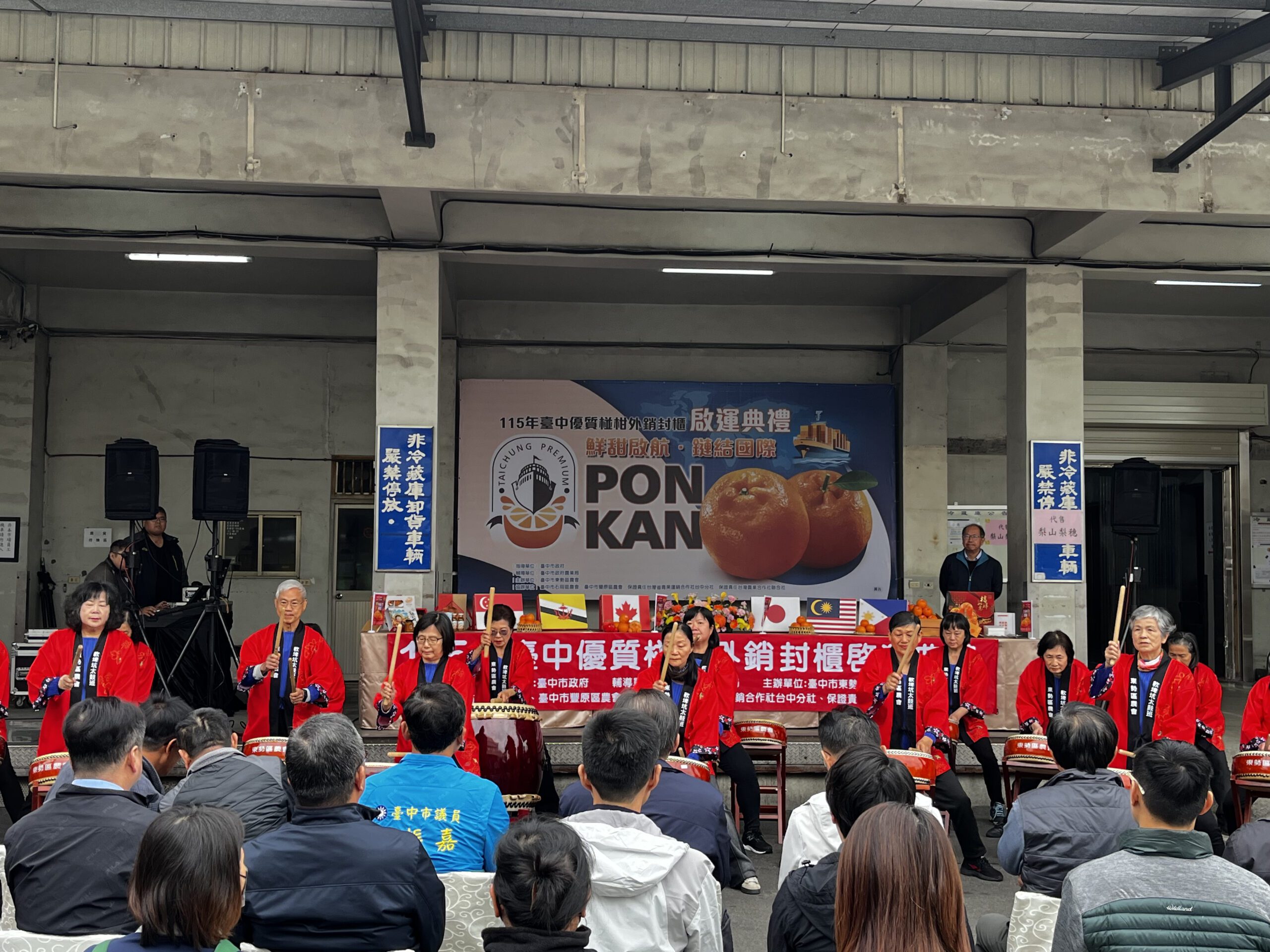台中市政府農業局持續輔導農民團體拓展農特產品外銷市場,今(12)日於東勢區農會舉辦「115年台中優質椪柑外銷封櫃啟運典禮」,宣告台中椪柑正式啟航、邁向國際。活動邀集產官學界代表共襄盛舉,見證台中優質椪柑在疫後持續深耕海外市場,透過穩定外銷通路提升國際能見度,也為農民創造更佳收益。今年度預計外銷總量達600公噸,銷往新加坡、馬來西亞、汶萊、日本及加拿大等國家。