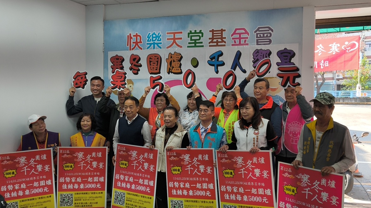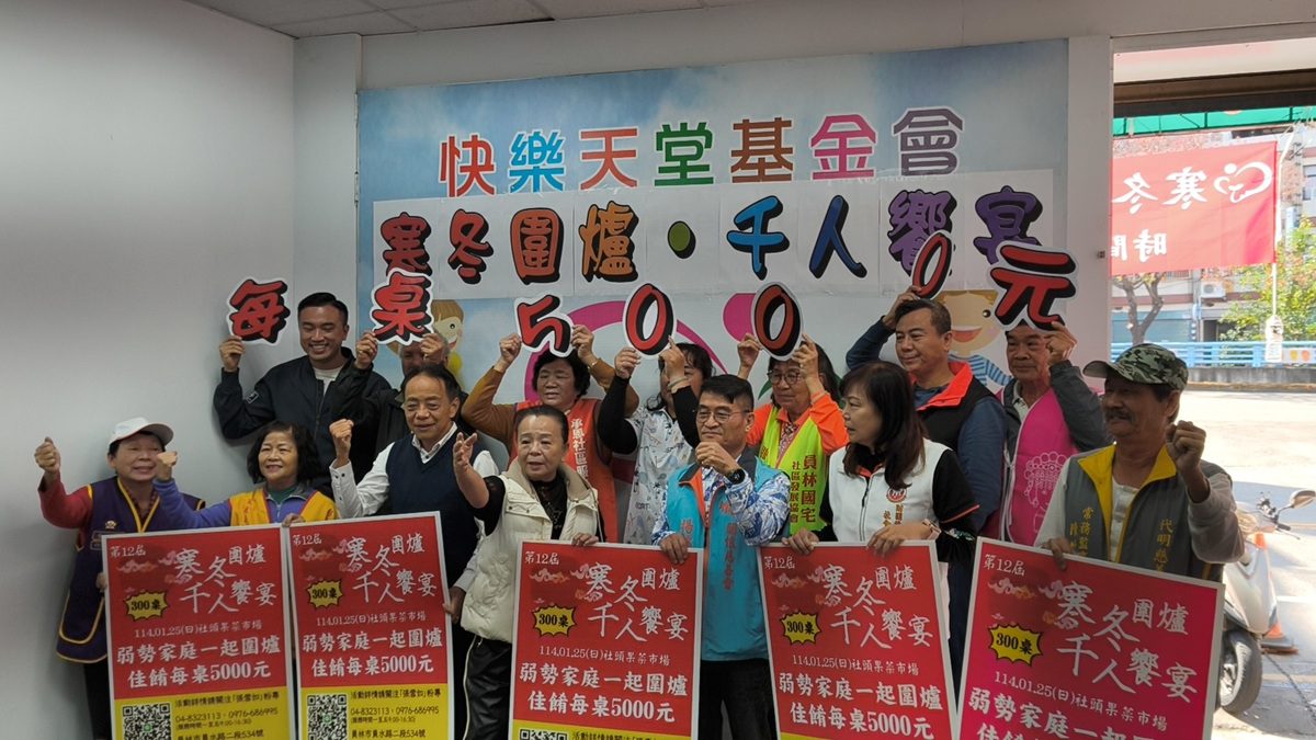 為關懷弱勢族群、傳遞社會溫暖,快樂天堂基金會於民國今年1月25日,在彰化縣社頭果菜市場隆重舉辦第十二屆「寒冬圍爐,千人饗宴」公益活動,邀請彰化縣低收入戶、貧困獨居老人、街友及邊緣戶,社會機構共襄盛舉,預計現場席開300桌,招待約3,000位弱勢朋友,一同圍爐迎新年。