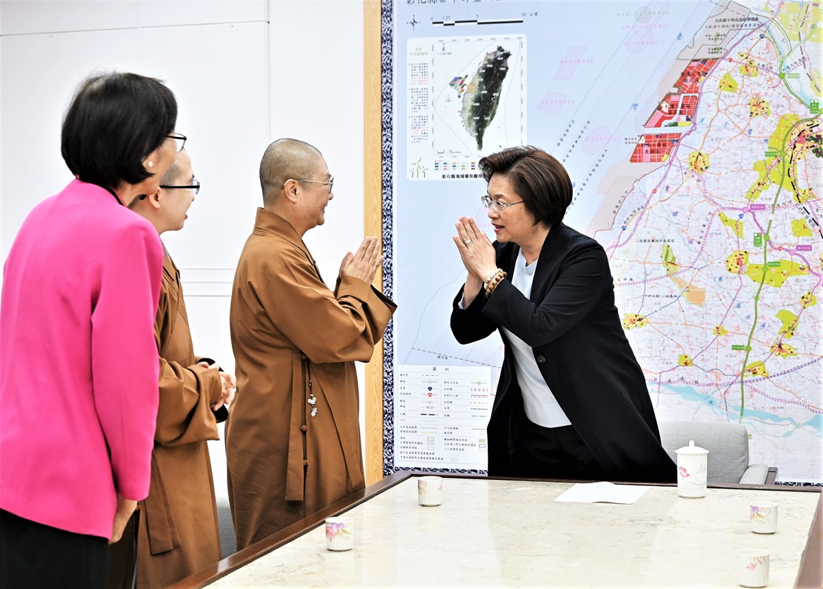 ▲佛光山彰化福山寺住持永嚴法師及國際佛光會中華總會副總會長周學文等人,上午蒞臨彰化縣政府拜訪王惠美縣長。(圖/記者蕭麗鳳攝)