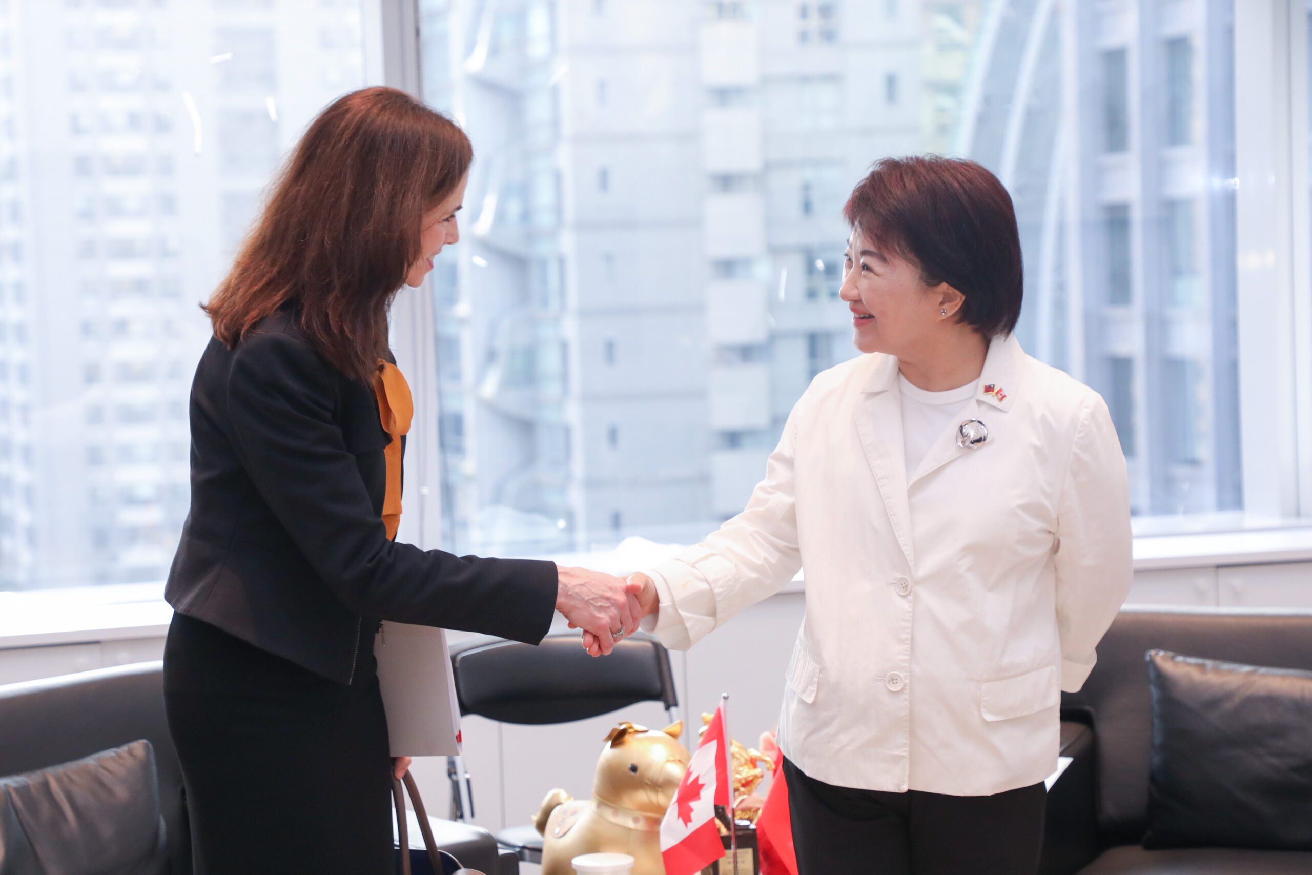 加拿大駐台北貿易辦事處新任代表何曼麗(Ms. Marie-Louise Hannan)昨(19)日拜會台中市政府,由市長盧秀燕親自接待,雙方就經貿、文化、教育議題交換意見。何代表高度肯定台中的宜居環境與城市魅力,盛邀盧市長出訪加國,持續深化雙邊情誼。盧市長也肯定加國的自然與人文,特別感謝何代表去年剛上任就出席台中爵士音樂節,為台中的慶典經濟增添光彩。