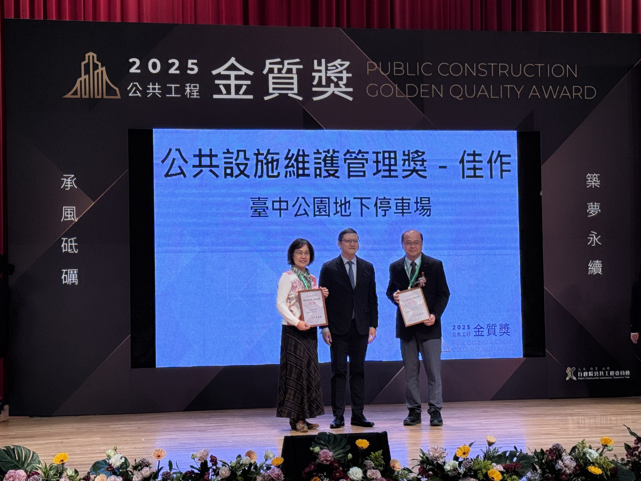 行政院今(21)日舉行第25屆公共工程金質獎頒獎典禮,「台中市北區台中公園地下停車場」榮獲公共設施維護管理類金質獎-佳作,這是繼勇奪國家卓越建設獎「最佳管理維護類特別獎」殊榮後,市府團隊再度受肯定。交通局長葉昭甫表示,40年歷史老舊停車場全面翻新,結合「舊城綠町故事館」,在評比中脫穎而出,成為今年全國唯一獲頒金質獎的停車場,更是全台首座奪得金質獎「維護管理類」殊榮的停車場,展現公共建設卓越成果,再添城市榮耀。