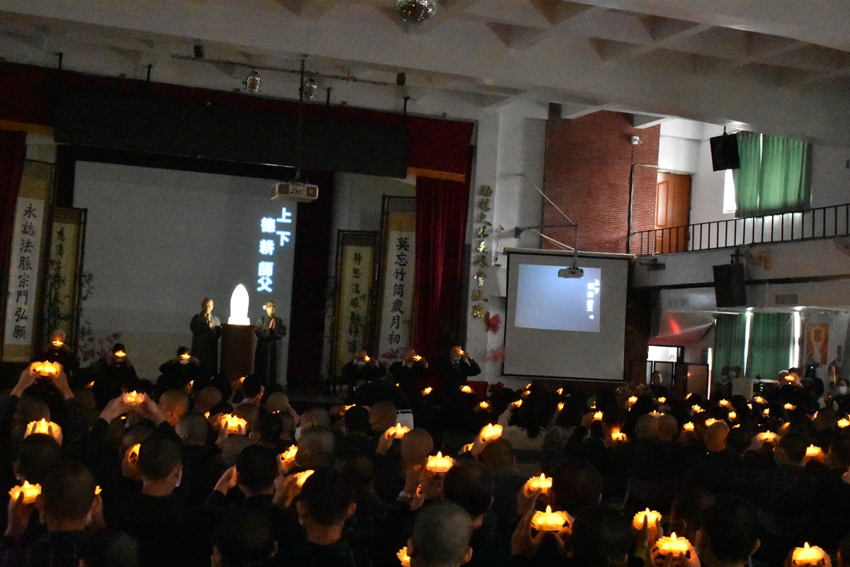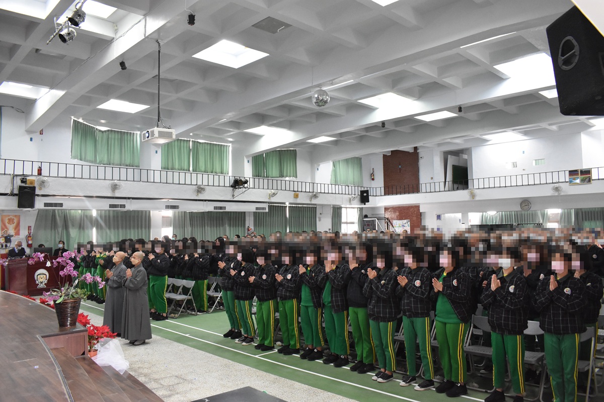 ▲慈濟精舍師父帶領全校師生手捧福慧燈,齊聲祈禱。(圖/勵志中學提供)
