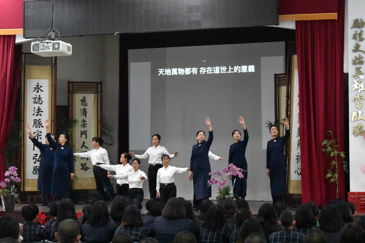 代理校長林岳賢在活動中勉勵同學,慈濟精神不僅是行善助人,更是一種落實於日常的生活態度與生命價值。他表示,「莫忘竹筒歲月初心」,提醒大家在順境中保持謙卑、在困境中不失善念;而「永誌法脈宗門弘願」,則期許勵志的學生能將慈悲、智慧與責任,實踐於學習歷程與人生選擇之中,讓生命走向更有力量的方向。