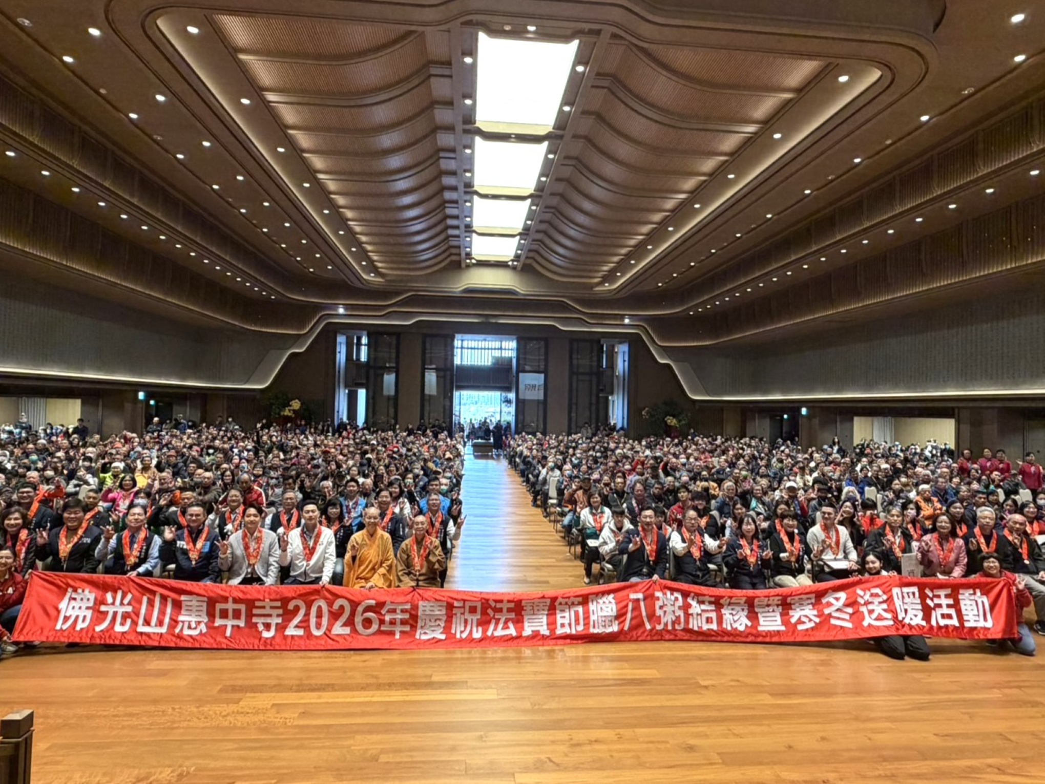 時逢歲末寒冬、春節將至,佛光山惠中寺攜手佛光山慈悲社會福利基金會,今(1)日於惠中寺三樓大殿舉辦慶祝法寶節暨寒冬送暖活動,發放1,400戶福田戶物資箱,並致送每戶3,600元關懷金,同時提供熱騰騰的臘八粥,為寒冬注入溫暖與祝福。台中市政府民政局長吳世瑋代表市長盧秀燕出席致意,肯定佛光山惠中寺長期投入公益關懷,以實際行動溫暖弱勢族群,並透過宗教文化傳遞正向能量,為社會帶來安定力量。