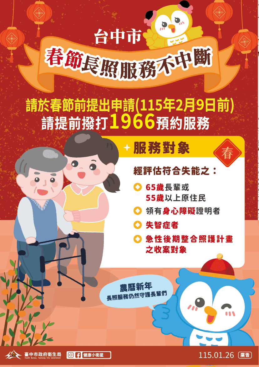 衛生局指出,市民若有春節期間的長照服務需求,請務必提前預約,並於115年2月9日(星期一)前撥打1966長照專線,向台中市長期照顧管理中心提出申請,即有專人協助評估與安排相關服務,包括居家照顧、日間照顧、家庭托顧、專業服務、輔具及居家無障礙環境改善、交通接送及喘息服務等,讓照顧安排更順利。