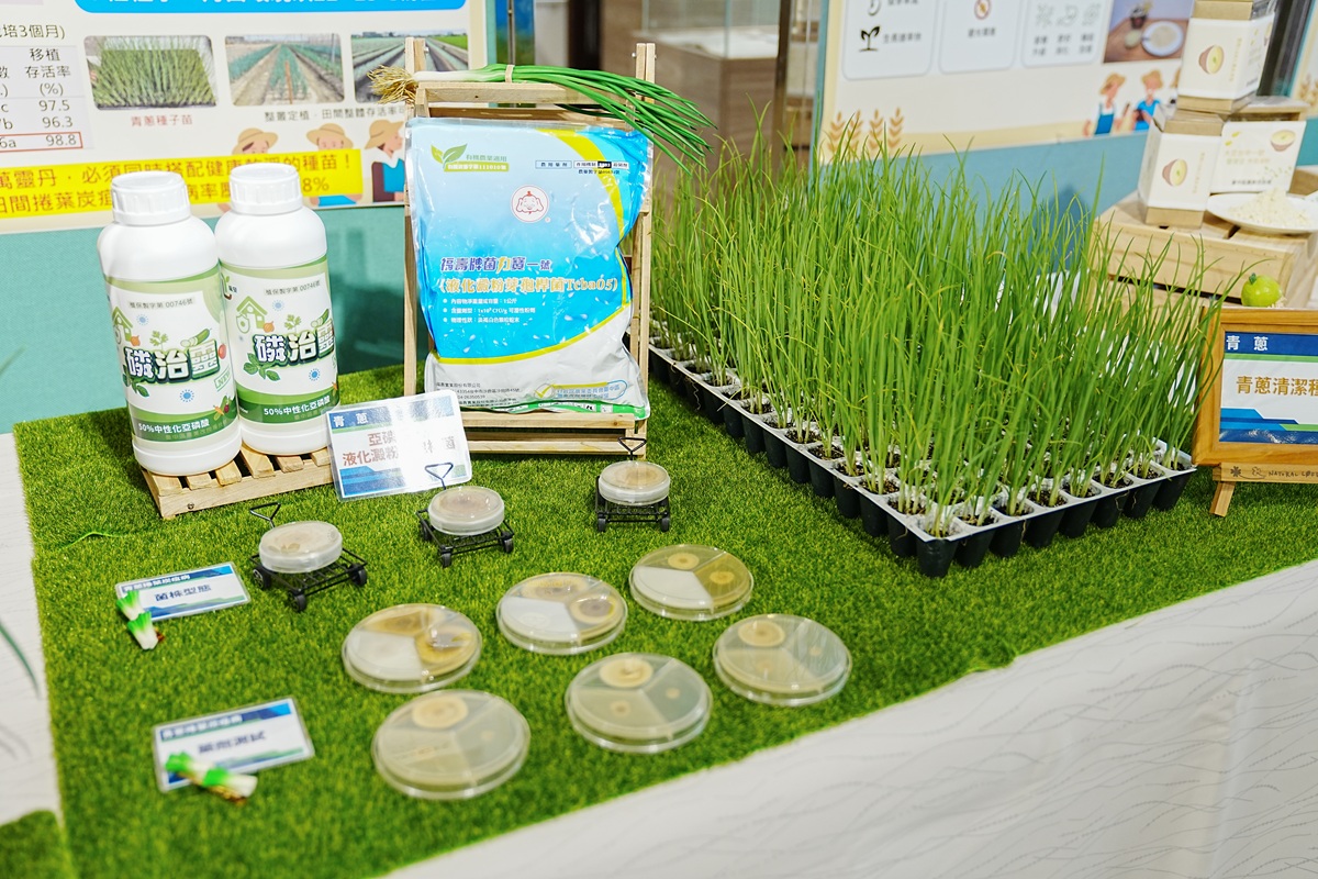 ▲臺中農改場展示青蔥捲葉炭疽病綜合管理技術。(圖/記者蕭麗鳳攝)