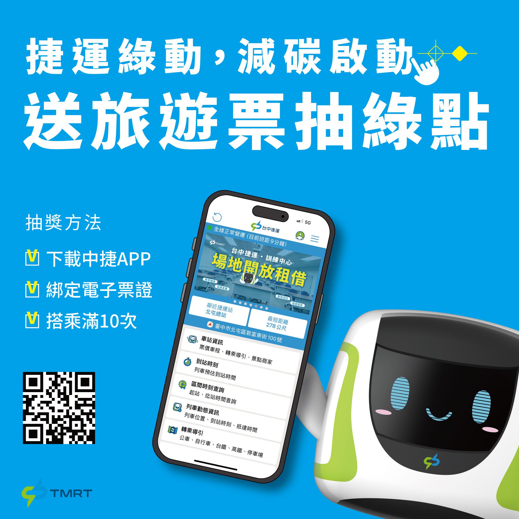 為鼓勵市民於日常通勤落實節能減碳,台中捷運公司攜手台中市政府環保局日前共同推出「捷運綠動,減碳啟動」活動,將送出24小時旅遊票,再抽10萬點綠點。中捷公司表示,只要下載台中捷運APP、綁定電子票證並完成搭乘任務,就能參加活動,搭捷運的同時也為地球永續盡一份心力。