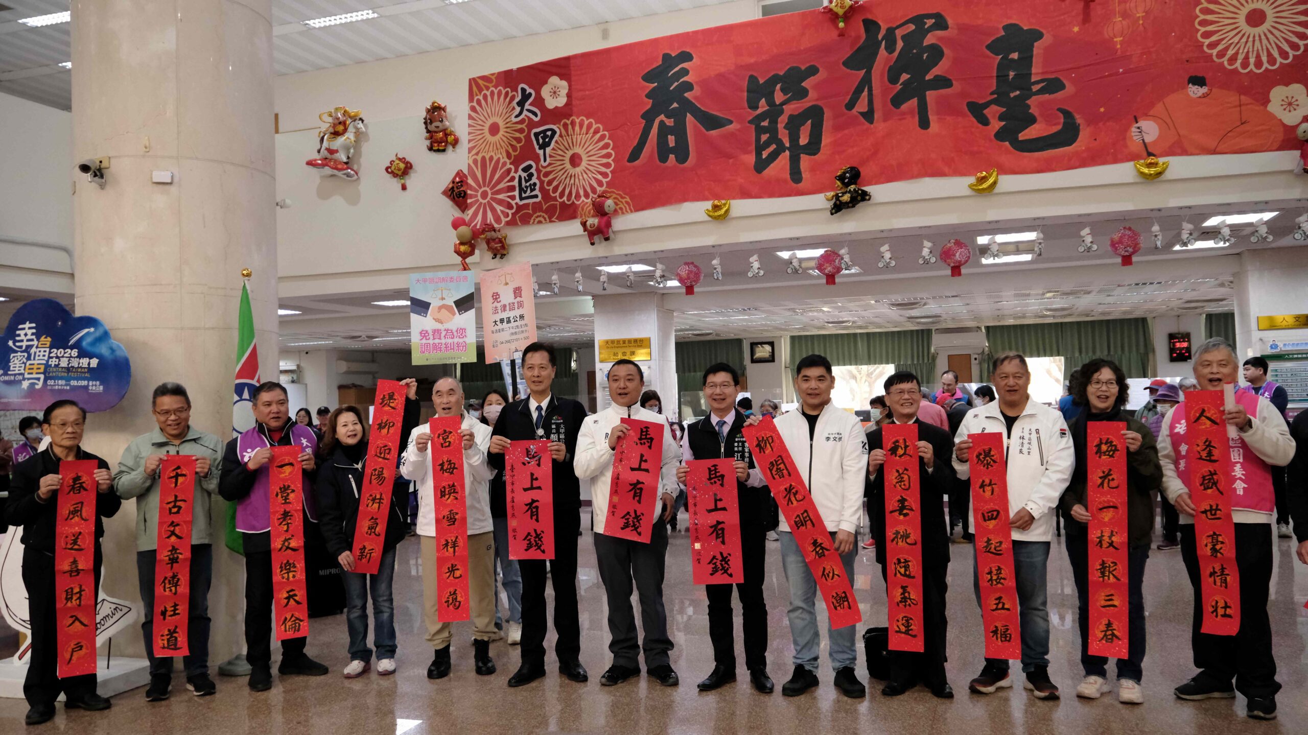 今天活動吸引超過800位市民排隊索取心儀春聯,場面熱鬧溫馨。市議員楊啟邦、施志昌、李文傑、市府客委會主委江俊龍、大甲區長顏金源、平安里長周寶惜、岷山里林清良、文建會前副主委洪慶峰、前市政顧問蔡璧如、大甲區團委會會長楊銘、台中市大甲區體育會理事長薛嘉銘煌皆到場共襄盛舉,向市民朋友獻上誠摯的新春祝福,祝願大家馬年行大運、幸福滿滿。