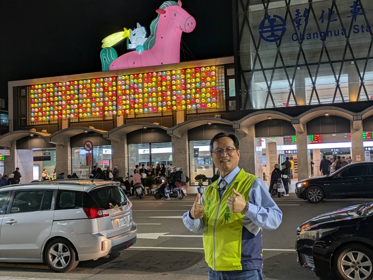 ▲市長林世賢在彰化火車站前介紹「半半騎在馬背上」的花燈。(圖/彰化市公所提供)