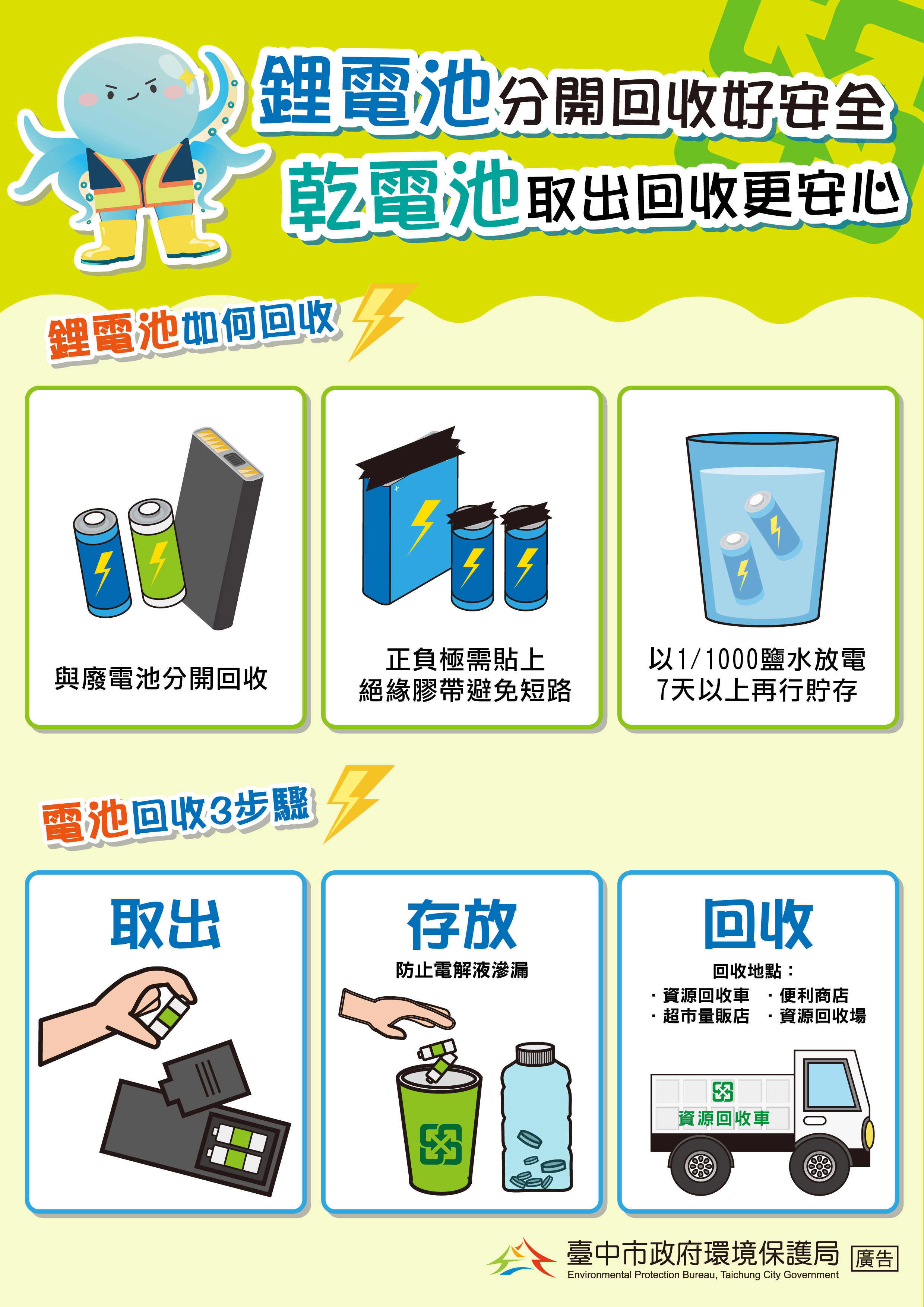 環保局提醒,充電式電器回收前應確實落實「取出、存放、回收」三步驟。回收前應先將電池自電器中取出,並以容器或塑膠袋單獨存放,鋰電池正負極需貼上絕緣膠帶以防短路,再交付資源回收車隨車人員、回收商或社區回收站,不得與一般垃圾或其他資源回收物混合投放,以降低火災風險。