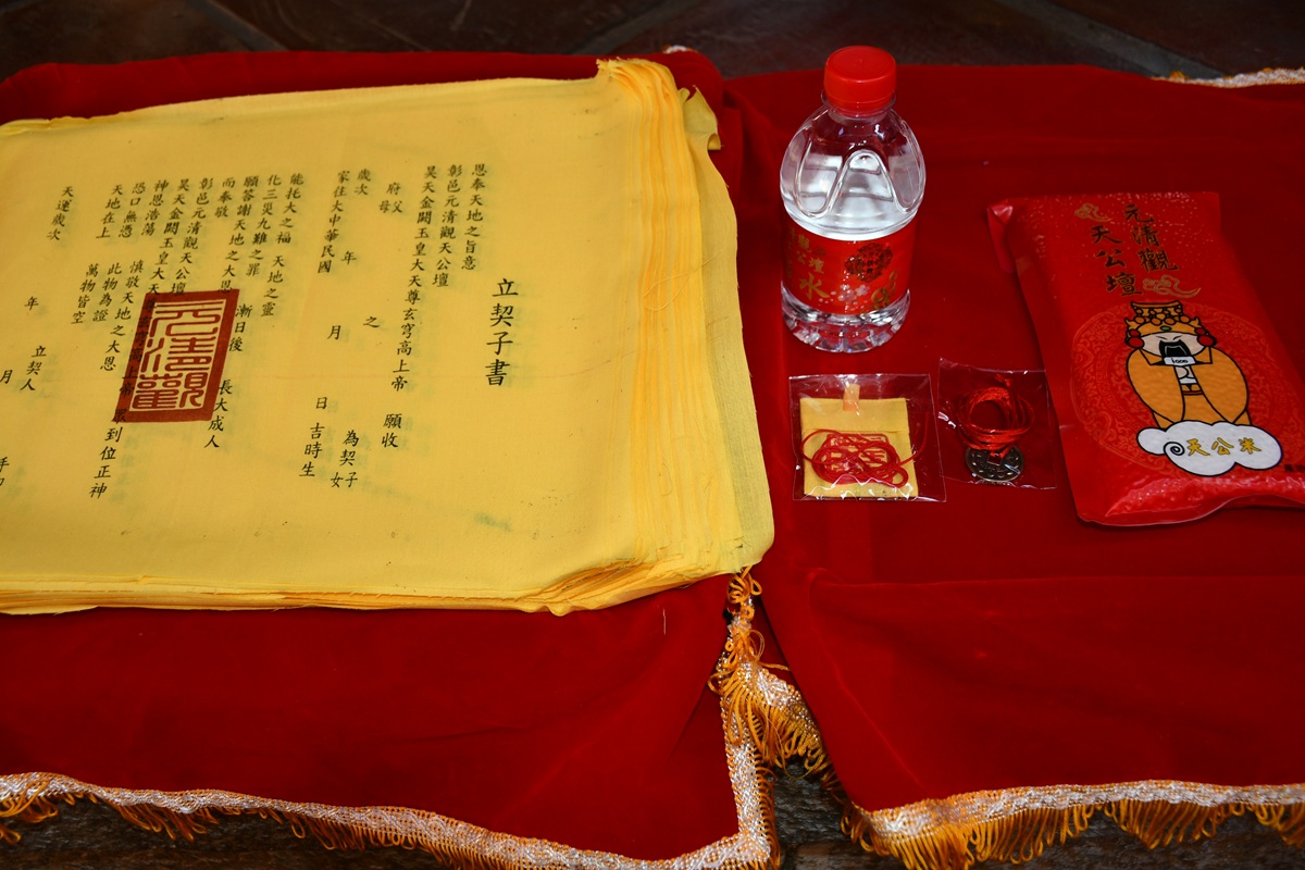 ▲參加者可獲得內含契子書、貫絭(絭錢)、錢水、天公米與平安符等寶物的福袋,祈求神明守護平安長大。(圖/記者蕭麗鳳攝)