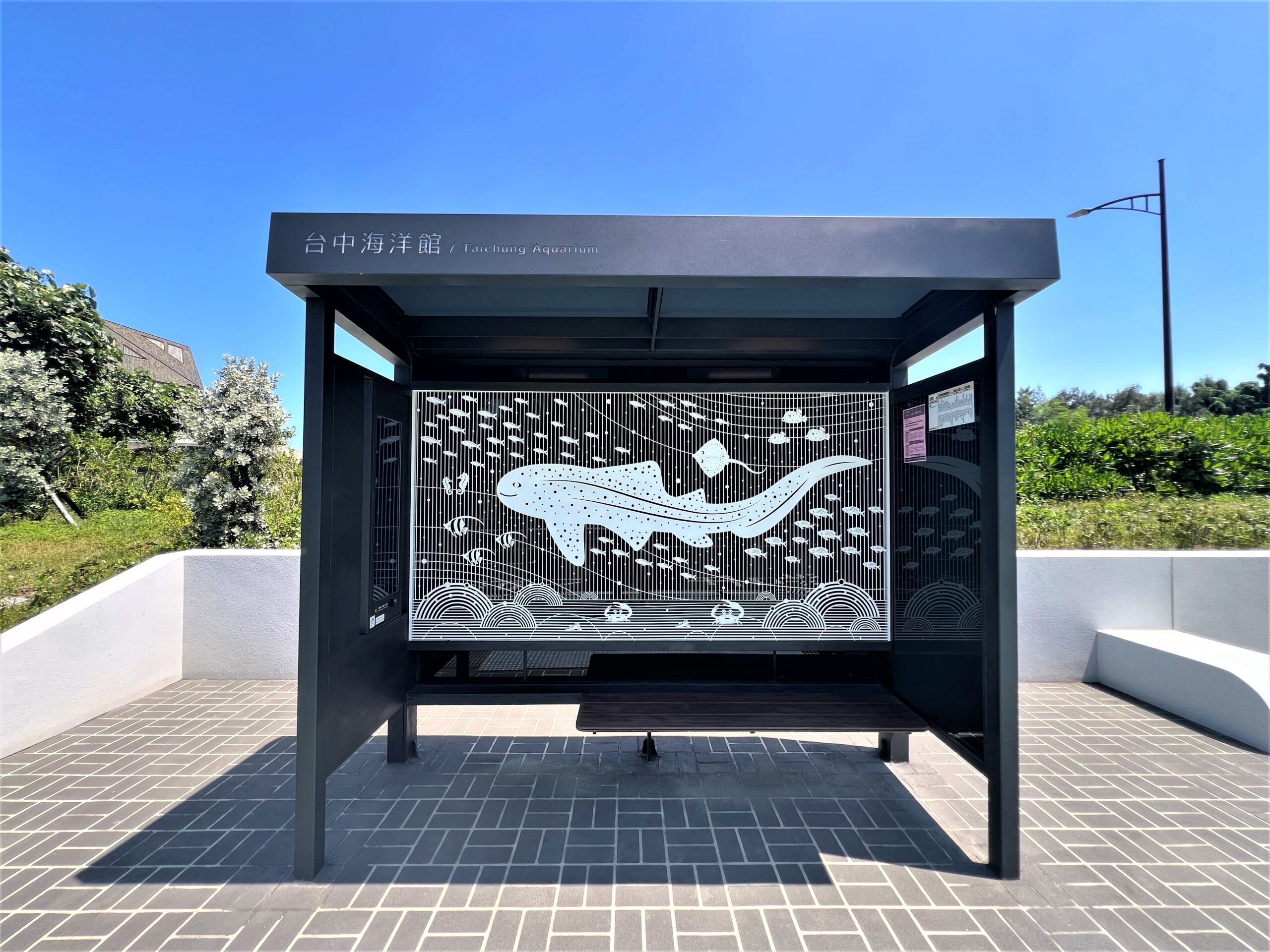 葉局長也以位在台中海洋館前候車亭為例,主角是悠遊大海的豹紋鯊,周圍有花點窄尾魟、管海馬、白吻雙帶立旗鯛、粒突箱魨、四線笛鯛等海洋朋友齊聚,往下看銀身彈塗魚、招潮蟹,搭公車到站馬上感受「到海洋館了!」的氛圍。