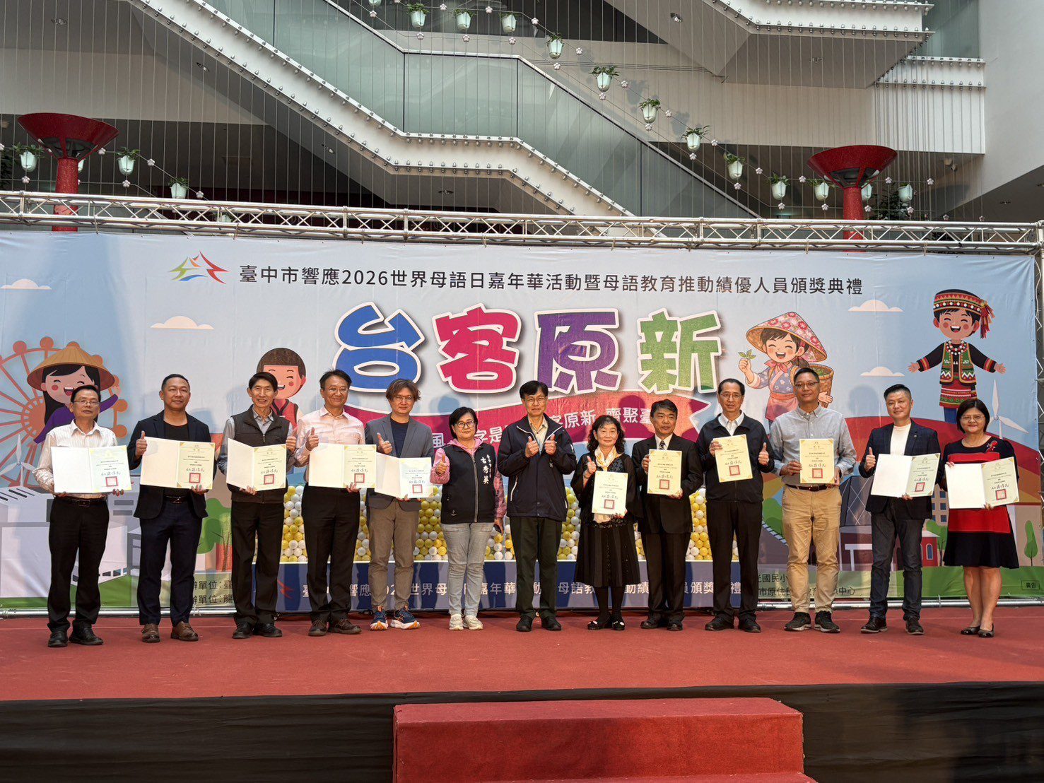響應世界母語日!台中市政府教育局今(6)日於台灣大道市政大樓舉辦「台中市響應2026世界母語日嘉年華活動暨母語教育推動績優人員頒獎典禮」,表揚本土語文特優學校、本土語文及新住民語文績優教育人員,活動透過展演、表揚與闖關活動,展現台中市深耕母語教育的成果與能量。