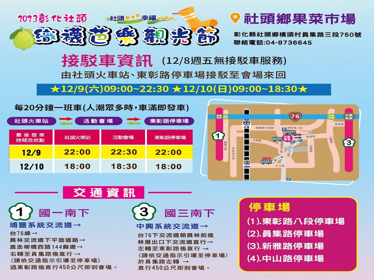 為了要讓更多民眾來鄉內旅遊,社頭鄉公所今年規劃免費巡迴接駁車,每10分鐘就有一班車,從火車站、杜鵑花大道(忠義路)、清水岩寺、織襪產業園區、月眉池,之後再進果菜市場,從12/8起到明年,歡迎大家來社頭鄉吃芭樂、買織襪。